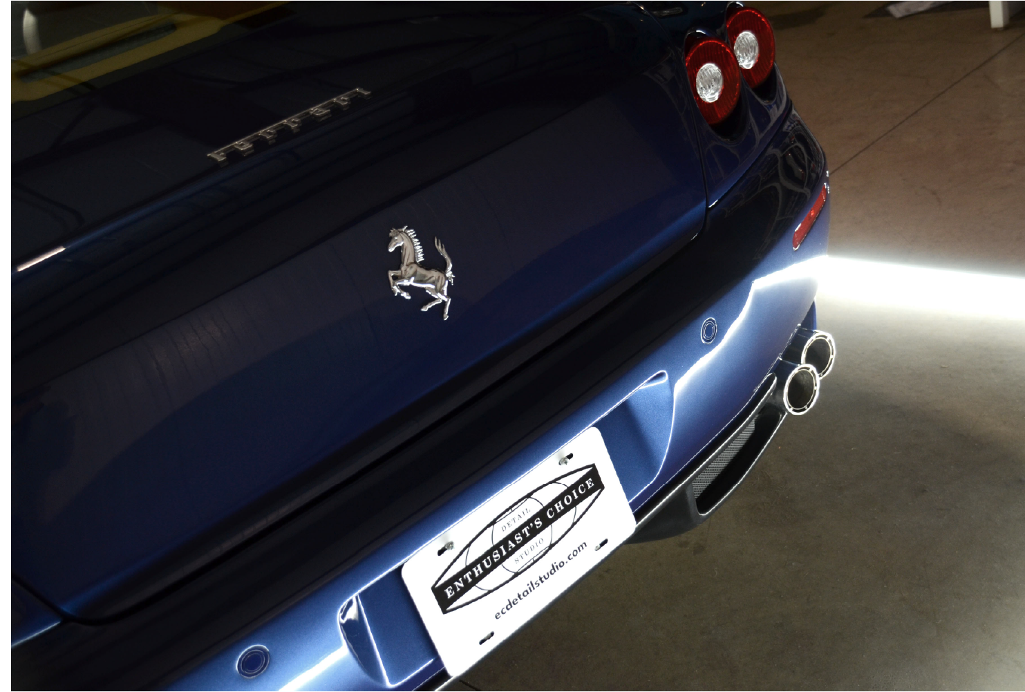 Our paint correction process included correcting the tail lights to give them the highly glossy and new appearance that makes a car like this really stand out. Being sure that the prancing horse badges were all cleaned up and polished could not be missed either. With the paint correction and polishing completed, the visual depth of the paint increased, and under our studio lights the metallic flecks in the paint really popped.